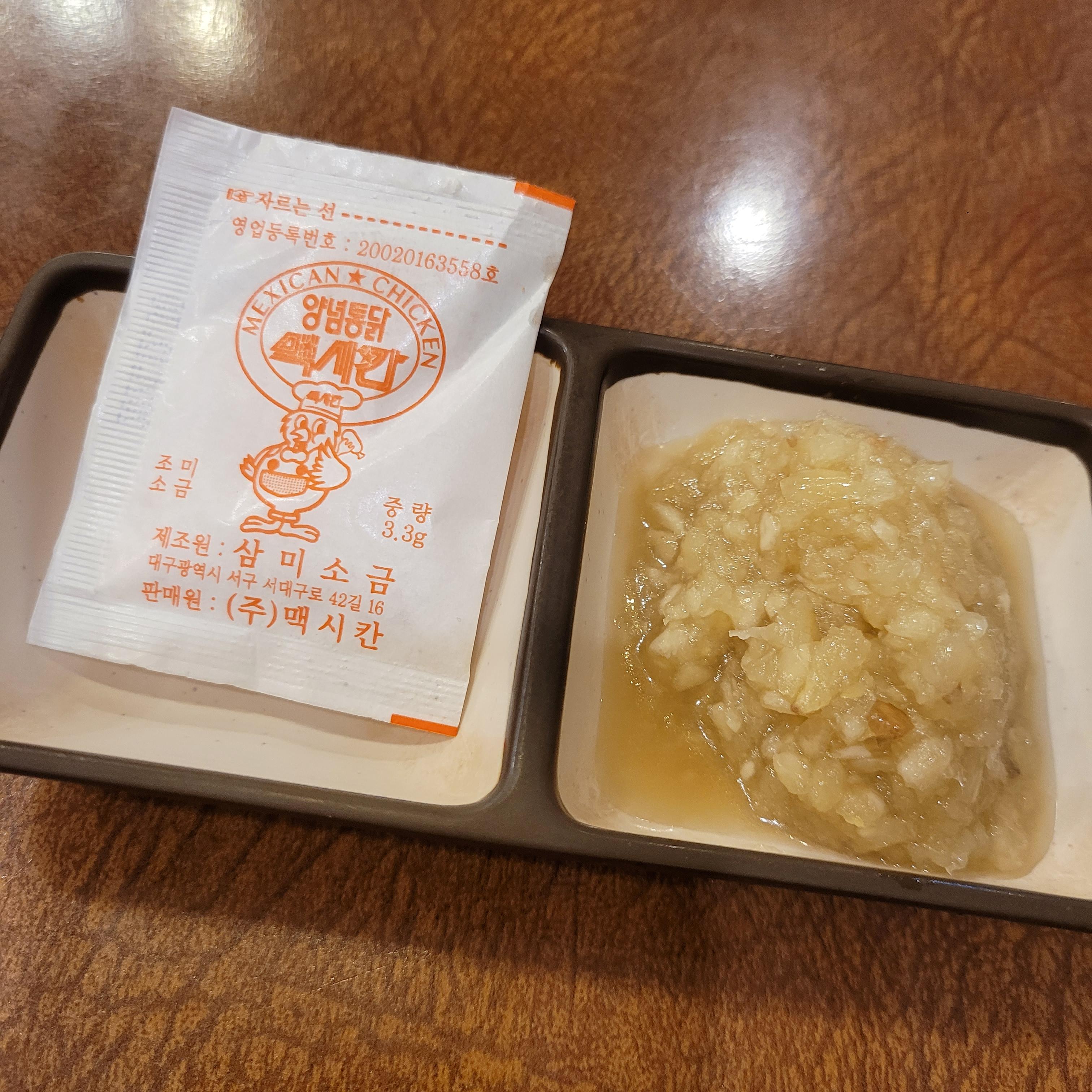 그리고 특이하게 소금양념이랑 같이 마늘양념이 나왔어요. 이건 직접만드시는 것 같더라구요.
